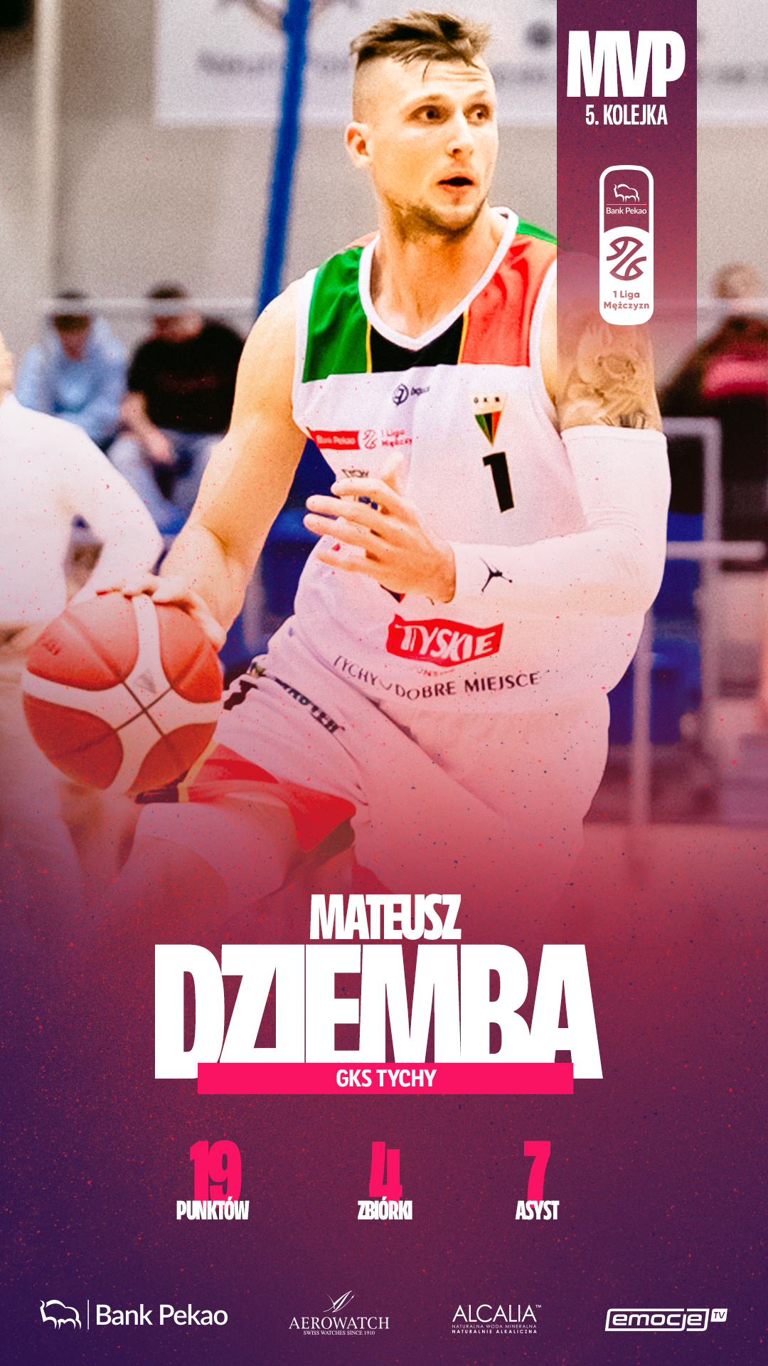 Mateusz Dziemba rozegrał bardzo dobry mecz, znacząco przyczyniając się do zwycięstwa GKS-u Tychy w kolejnym spotkaniu Pekao 1 Ligi Mężczyzn. Zawodnik tyszan od pierwszych minut był aktywny w ofensywie, trafiał z dystansu i skutecznie kończył akcje pod koszem. W kluczowych momentach spotkania zdobywał punkty, które pozwalały utrzymać przewagę nad rywalem.