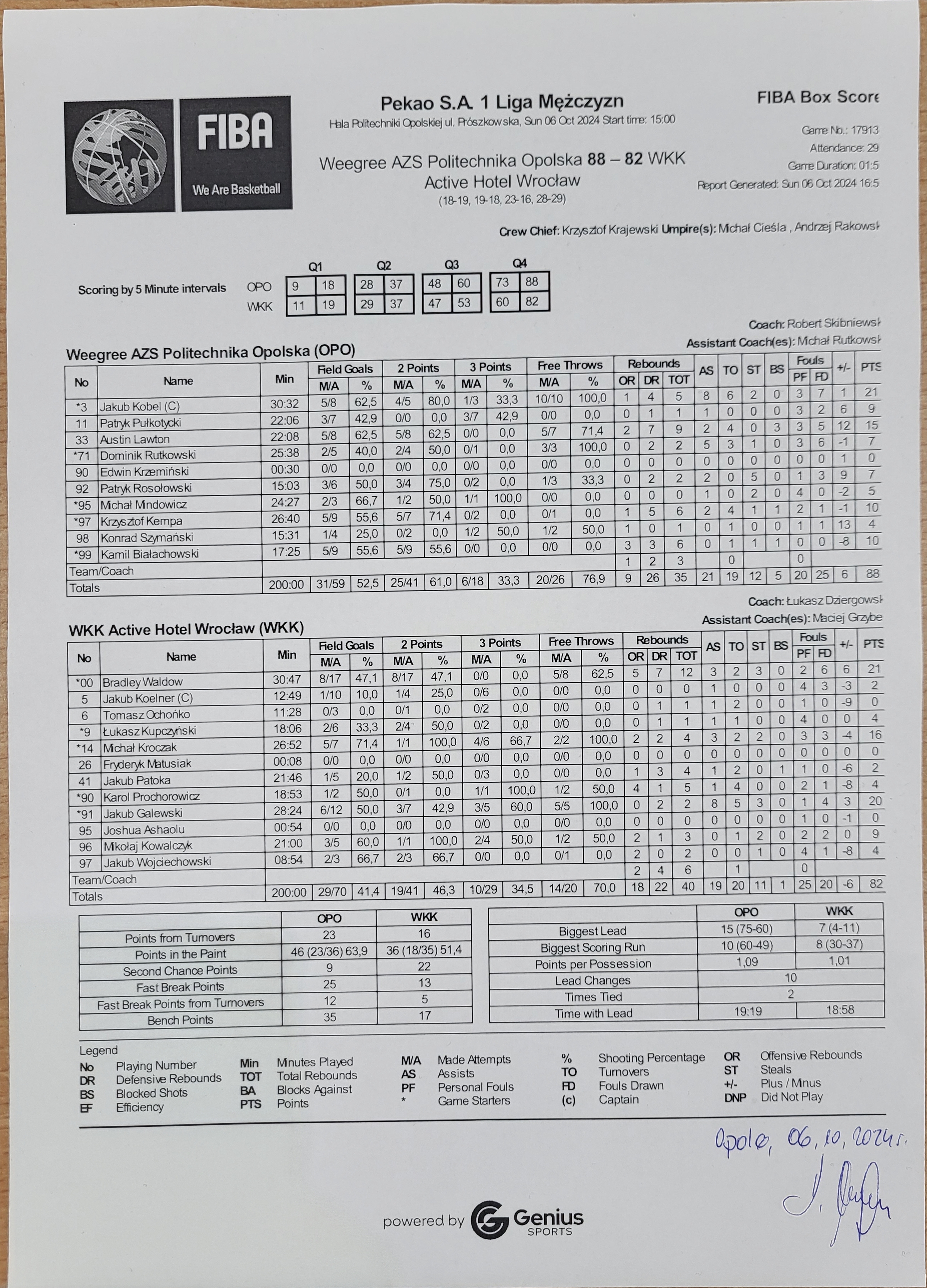 | 97 | Krzysztof Kempa | 10 | 26:40 | 5/7 | 71.4 | 0/2 | 0.0 | 5/9 | 55.6 | 0/1 | 0.0 | 1 | 5 | 6 | 2 | 2 | 1 | 4 | 1 | 1 |   | 11 | -1 | |