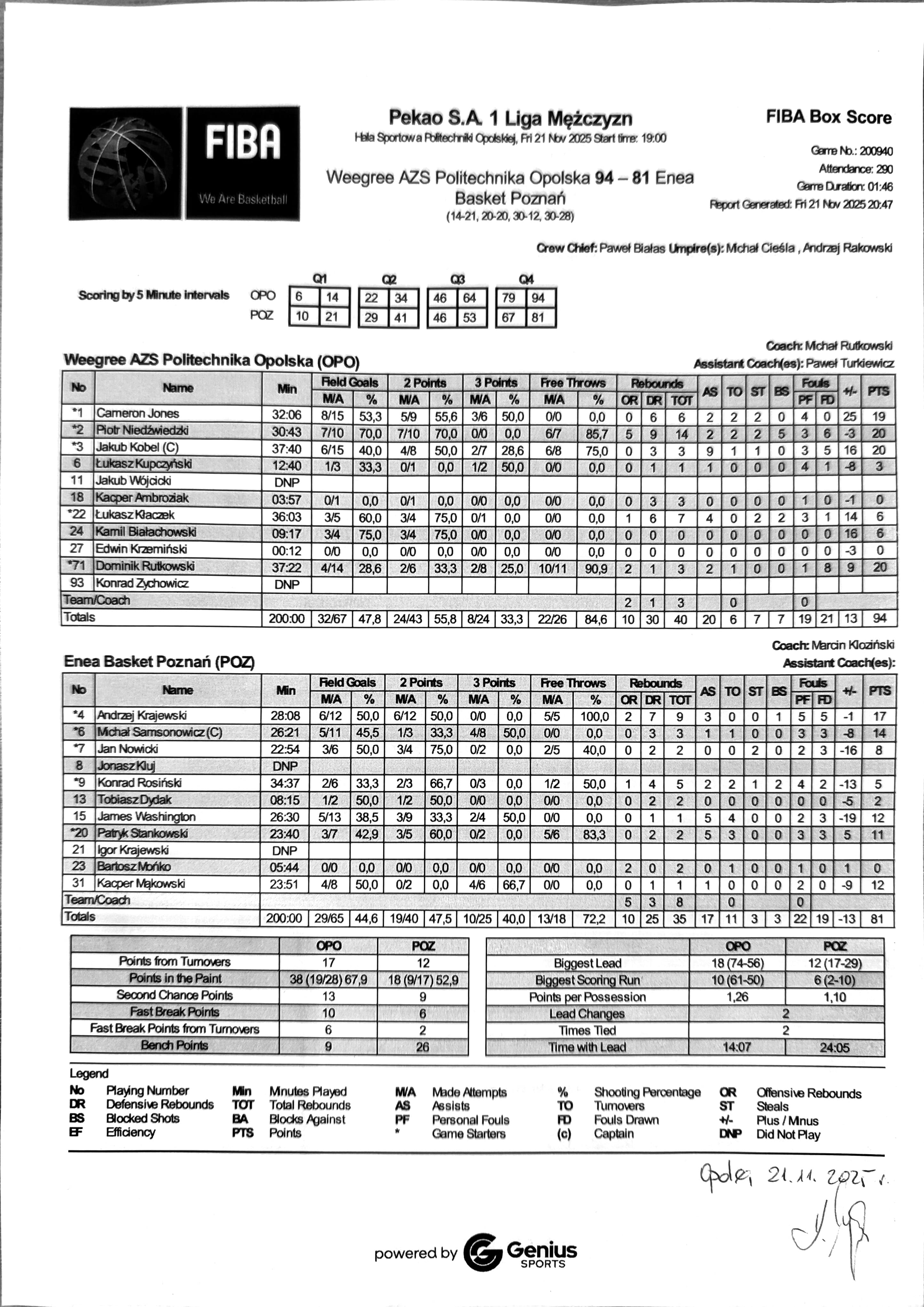 | 20 | Patryk Stankowski | 11 | 23:40 | 3/5 | 60.0 | 0/2 | 0.0 | 3/7 | 42.9 | 5/6 | 83.3 |   | 2 | 2 | 5 | 3 | 3 | 3 |   |   | 1 | 10 | 5 | |