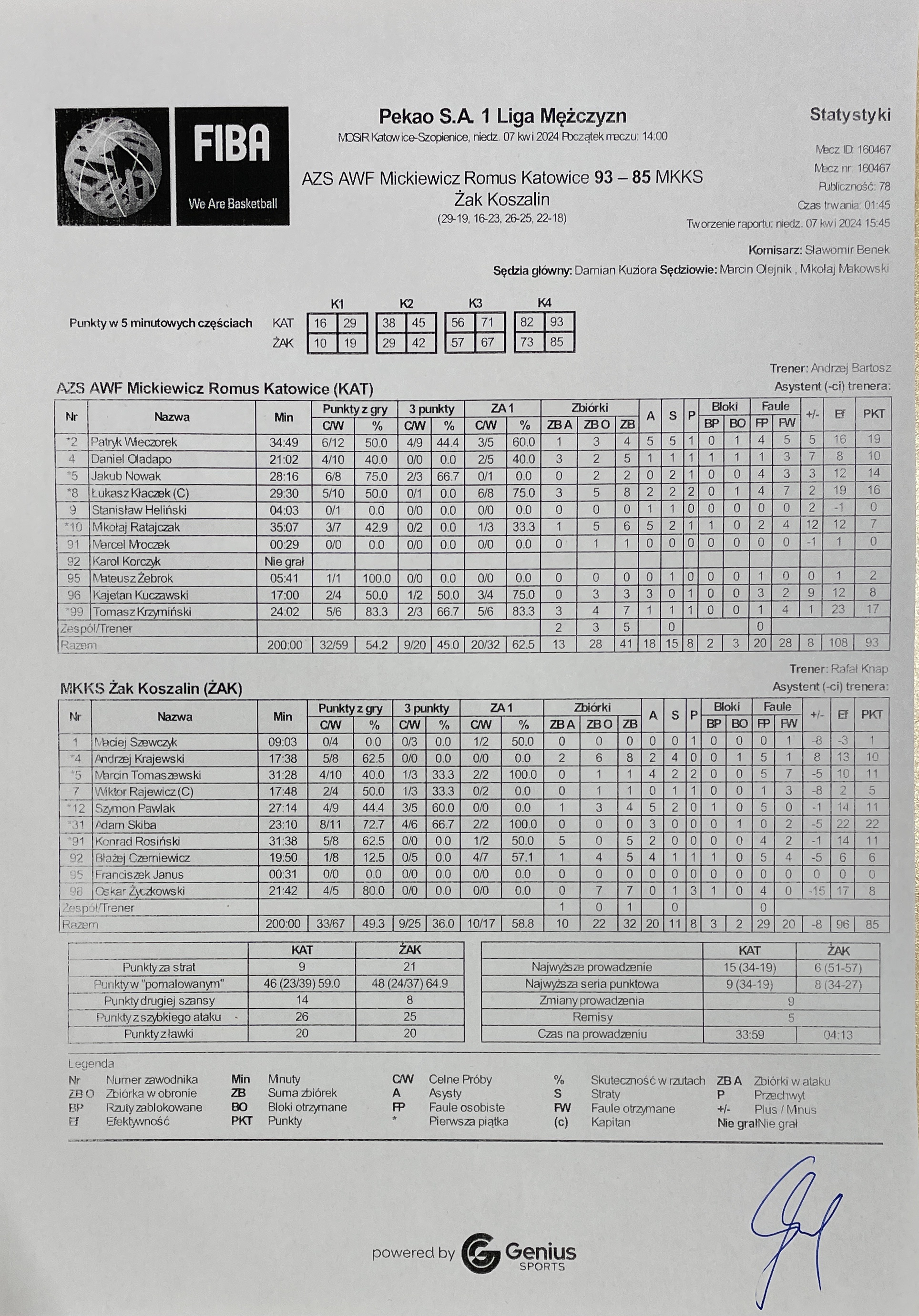 | 8 | Łukasz Kłaczek | 16 | 29:30 | 5/9 | 55.6 | 0/1 | 0.0 | 5/10 | 50.0 | 6/8 | 75.0 | 3 | 5 | 8 | 2 | 4 | 7 | 2 | 2 |   | 1 | 19 | 2 | |