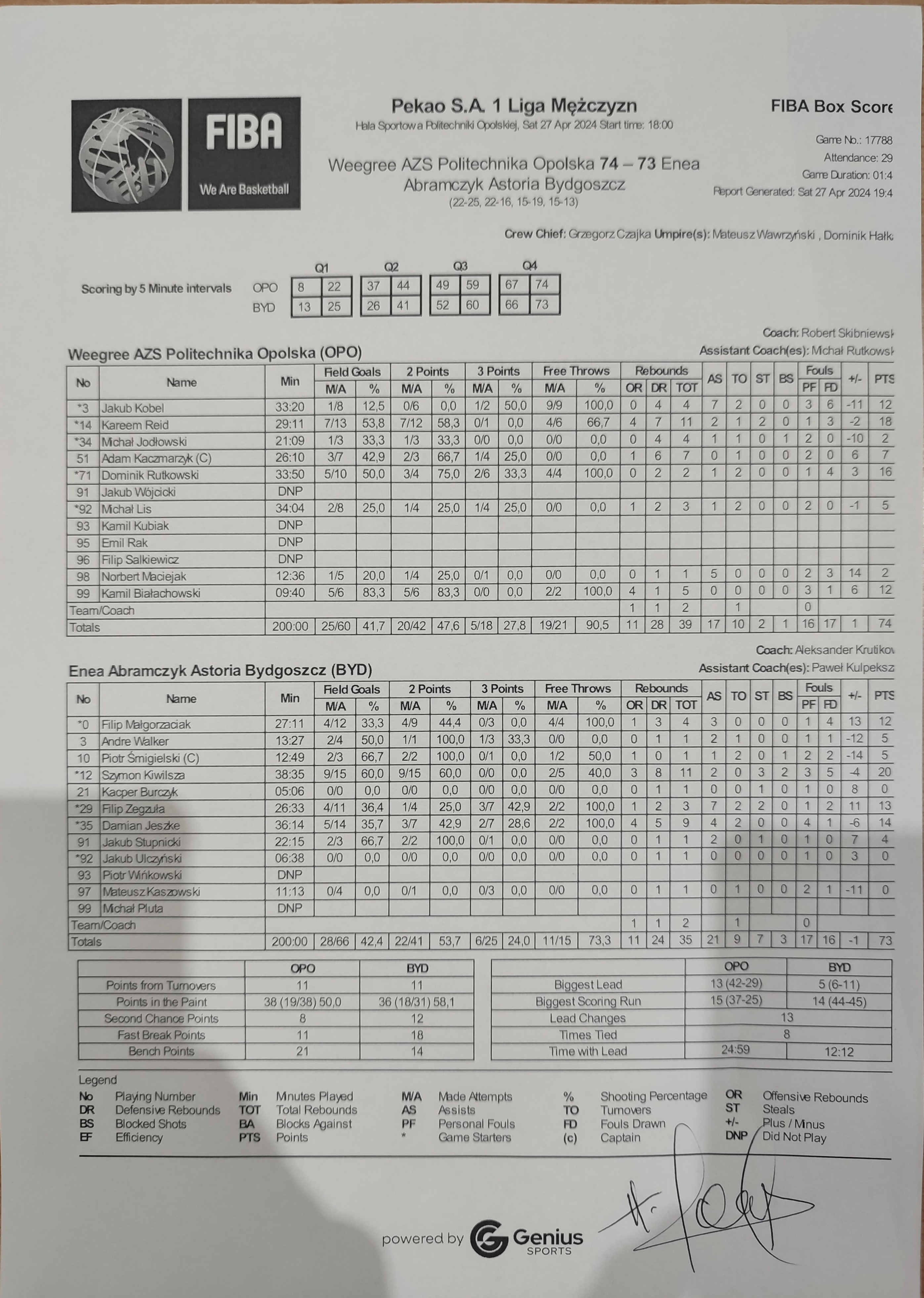 | 0 | Filip Małgorzaciak | 12 | 27:11 | 4/9 | 44.4 | 0/3 | 0.0 | 4/12 | 33.3 | 4/4 | 100.0 | 1 | 3 | 4 | 3 | 1 | 4 |   |   |   |   | 11 | 13 | |