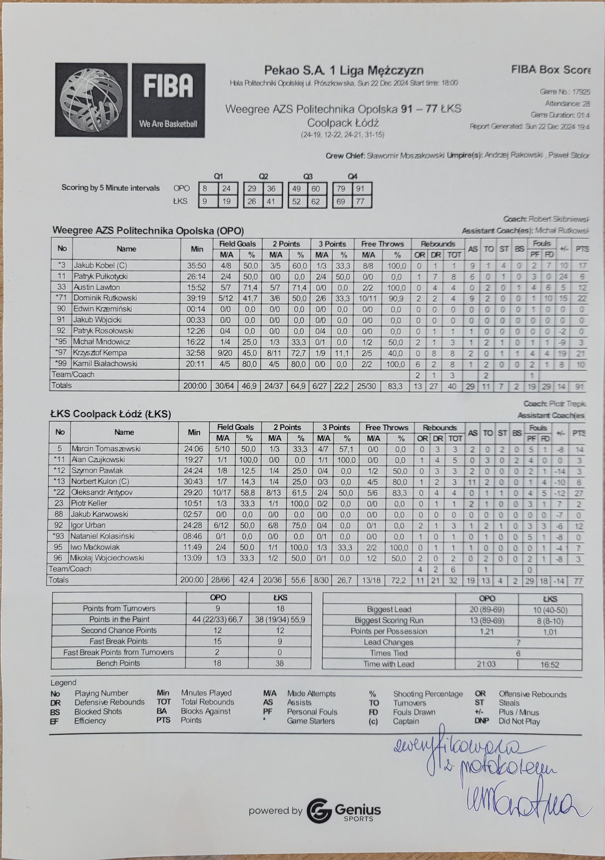 | 92 | Patryk Rosołowski | 0 | 12:26 |   |   | 0/4 | 0.0 | 0/4 | 0.0 |   |   |   | 1 | 1 | 1 |   |   |   |   |   |   | -2 | -2 | |