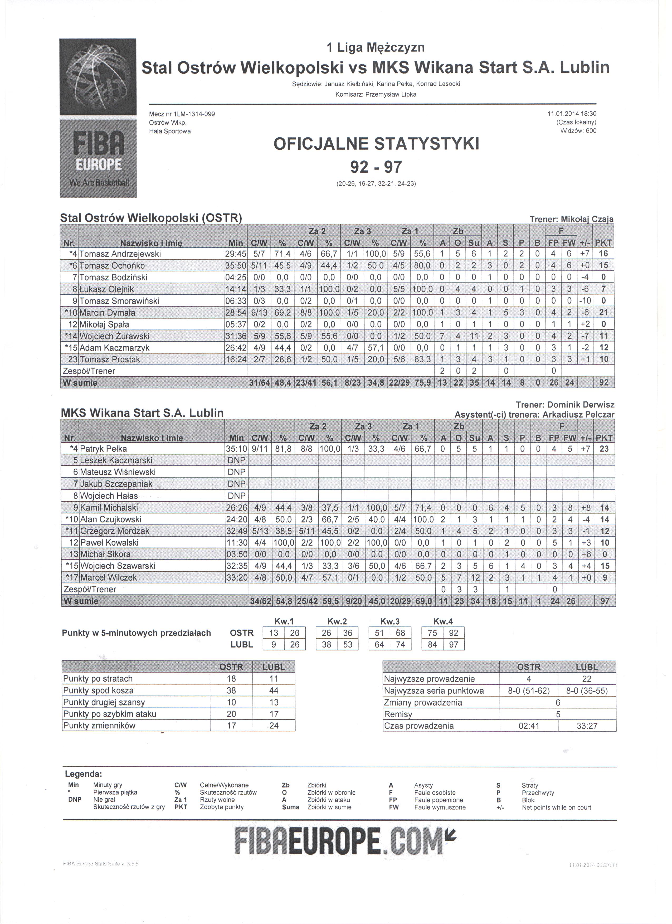 M. Dymała - faul osobisty w akcji rzutowej (4 F, 8 Faul zespołu). Przyznano 2 rzuty wolne. Faulowany: W. Szawarski |
